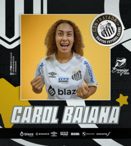 Carol Baiana é o quarto reforço das Sereias da Vila para 2024. A experiente atacante, de 29 anos, chega para sua primeira passagem pelo Santos vinda do Cruzeiro, por onde disputou a última temporada. O vínculo com o Alvinegro Praiano se estende até o fim deste ano.
