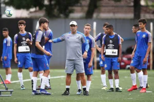 O técnico Márcio Griggio orienta seus jogadores em treino do time sub-17 (Crédito: Pedro Ernesto Guerra Azevedo/Santos FC)