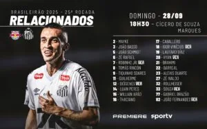 O Santos divulgou a lista de relacionados para o jogo contra o Red Bull Bragantino neste domingo (28), às 18h30min, no Cícero de Souza Marques, pela 25ª rodada do Brasileirão. São três goleiros, quatro zagueiros, três laterais, sete meio-campistas e sete atacantes que viajaram na delegação.