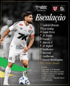 O Santos vai a campo com a seguinte formação: Gabriel Brazão; Leo Godoy, Zé Ivaldo, Luan Peres e Souza; Tomás Rincón, Zé Rafael e Rollheiser; Barreal, Guilherme e Deivid Washington.