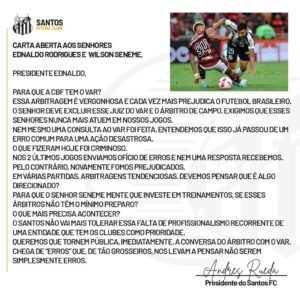 A carta foi assinada pelo presidente santista, Andres Rueda, e foi direcionada para o comandante da Confederação Brasileira de Futebol, Sr. Ednaldo Rodrigues, e também Wilson Seneme, ex-árbitro e presidente da comissão de arbitragem da CBF.