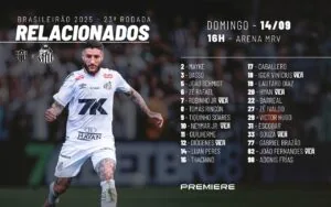 O Santos divulgou a lista de relacionados para o jogo contra o Atlético-MG neste domingo (14), às 16 horas, na Arena MRV, pela 23ª rodada do Brasileirão. A equipe conta com três goleiros, quatro zagueiros, quatro laterais, sete meio-campistas e seis atacantes.