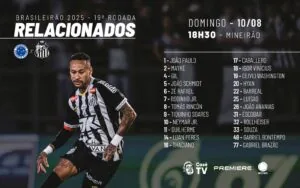 O Santos divulgou no início da manhã deste domingo (10) a lista com os jogadores relacionados para o duelo de logo mais diante do Cruzeiro, no Mineirão, pelo Campeonato Brasileiro.