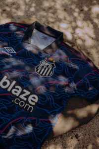 Para reforçar essa estética, o novo manto santista conta com uma etiqueta especial na manga da camisa. O selo tem o nome “Japan” em uma fonte manuscrita inspirada na escrita japonesa, com a bandeira do país asiático mesclada com o nome de forma estilizada e moderna. A nova terceira camisa oficial ainda possui gola ao estilo ‘morcego’ em azul escuro, assim como no punho da manga.