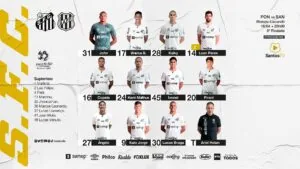 O Santos está escalado com Jhon, Vinícius Balieiro, Kaiky Fernandes, Luan Peres e Copete; Kevin Malthus, Ivonei e Gabriel Pirani; Ângelo, Kaio Jorge e Lucas Braga.
