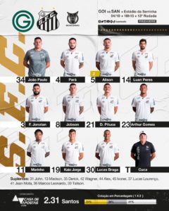 Desta forma, Cuca escalou o Peixe com a seguinte formação: João Paulo; Pará, Alison, Luan Peres e Felipe Jonatan; Diego Pituca, Jobson e Arthur Gomes; Lucas Braga, Kaio Jorge e Marinho.