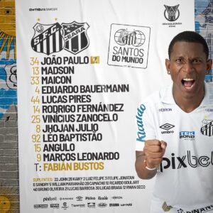 O Santos joga com João Paulo, Madson, Maicon, Eduardo Bauermann e Lucas Pires; Rodrigo Fernández, Vinícius Zanocelo e Léo Baptistão; Jhojan Julio, Marcos Leonardo e Bryan Angulo.