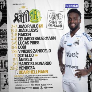 Assim, o Santos está escalado com: João Paulo; João Lucas, Maicon, Eduardo Bauermann e Lucas Pires; Dodi, Vinícius Zanocelo e Soteldo; Ângelo, Marcos Leonardo e Mendoza.