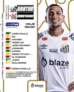 O Santos está escalado para enfrentar o Corinthians na noite desta quarta-feira, pela sexta rodada do Campeonato Paulista. O técnico Fábio Carille mantém a base do time que venceu nas últimas duas rodadas, mas teve que promover duas mudanças devido à lesões.