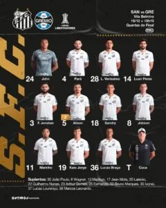 O Santos vai a campo com: John; Pará, Lucas Veríssimo, Luan Peres e Felipe Jonatan; Alison, Sandry e Jobson; Marinho, Lucas Braga e Kaio Jorge.