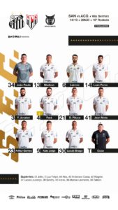 Assim, o Santos vai a campo com a seguinte escalação: João Paulo; Madson, Laércio, Luan Peres e Felipe Jonatan; Diego Pituca, Pará e Jean Mota; Lucas Braga, Kaio Jorge e Arthur Gomes.