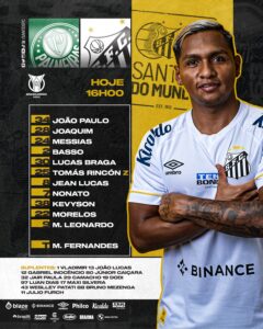O Santos começa o clássico com João Paulo, Joaquim, João Basso e Messias; Lucas Braga, Tomás Rincón, Jean Lucas, Nonato e Kevyson; Morelos e Marcos Leonardo.