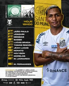 O Santos começa o clássico com João Paulo, Joaquim, João Basso e Messias; Lucas Braga, Tomás Rincón, Jean Lucas, Nonato e Kevyson; Morelos e Marcos Leonardo.