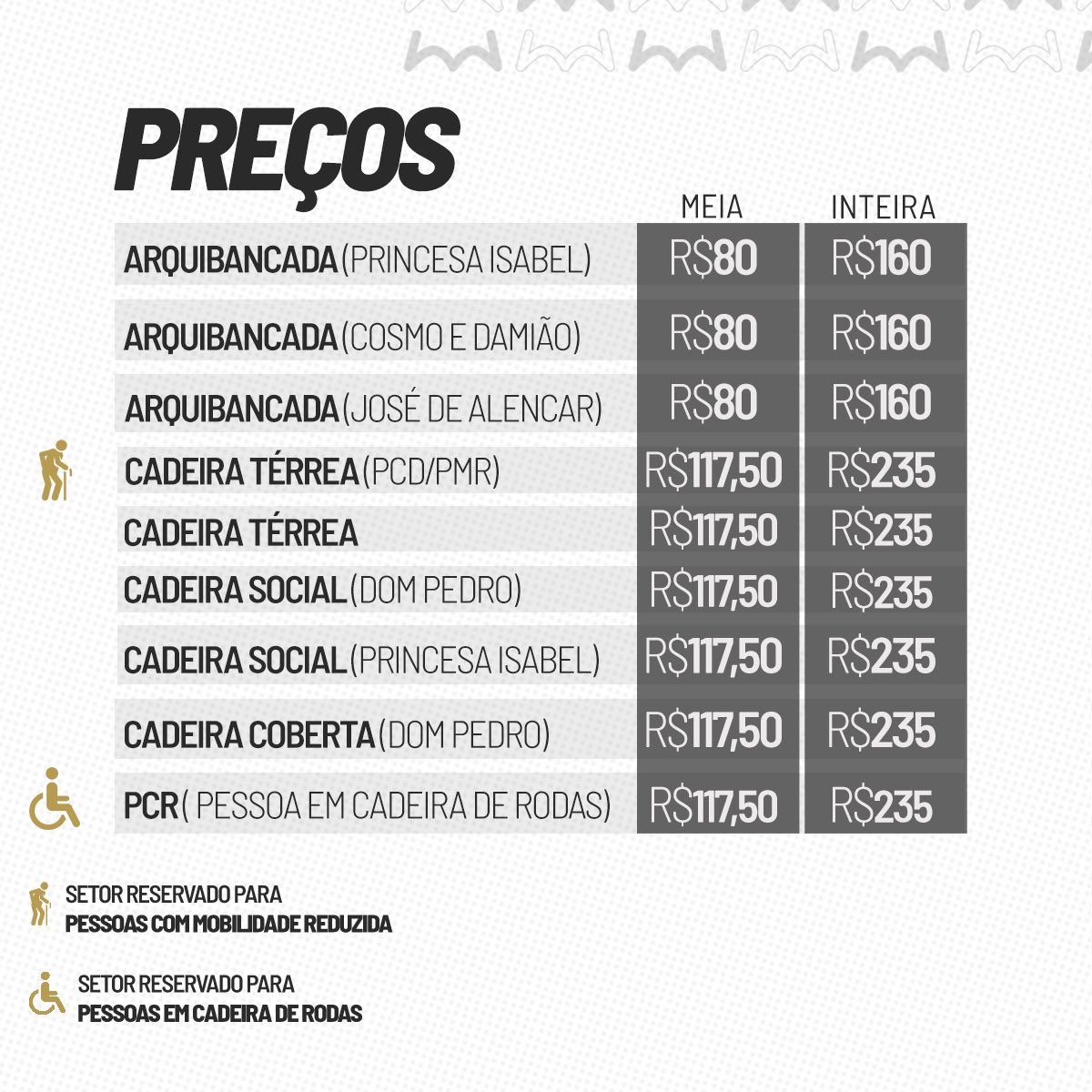 Lei Federal 12.933/2013: Possuem o benefício da meia-entrada pessoas com deficiência física e seu acompanhante, quando necessário. Para compra, retirada e acesso ao estádio, é obrigatório apresentar o documento de PCD ou laudo médico e o Documento de identidade original (RG) ou cópia autenticada.