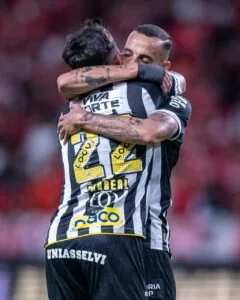 Barreal e Guilherme comemoram o gol do Santos no empate com o Internacional (Crédito: Raul Baretta/SantosFC)
