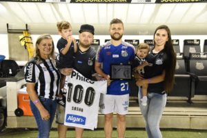 Eduardo Sasha recebeu uma homenagem antes da partida diante da Inter de Limeira, na noite desta quinta-feira. O atacante completou 100 jogos com a camisa do Peixe na última rodada, diante do Guarani e a homenagem contou com membro da sua família no gramado da Vila Belmiro.