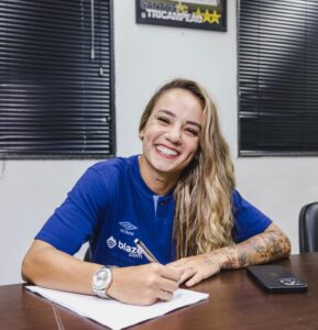 Natural de São Paulo (SP), a atleta tem 31 anos. Ao todo pelo Peixe, são 187 confrontos e 78 gols anotados. Ela iniciou no Juventus da Mooca, teve a primeira passagem nas Sereias entre 2009 e 2011 e também atuou pelo Vitória das Tabocas e Incheon Hyundai (Coreia do Sul). Retornou ao Alvinegro em 2020 e está no clube desde então.