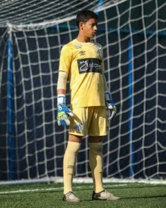 O goleiro Thiago Vasconcelos comemorou a assinatura do contrato de formação com o Santos. Ele completou 14 anos neste ano e agora tem vínculo até 4 de março de 2027. Há seis anos no clube, o arqueiro começou com a iniciação no futsal e tem registros de campo desde 2022.