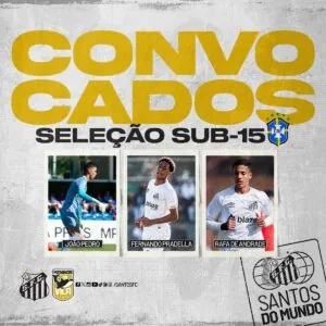 O goleiro João Pedro, o lateral-esquerdo Rafael Gonzaga e o atacante Fernando Pradella foram convocados pela Seleção Brasileira Sub-15 para uma nova fase de preparação na Granja Comary entre os dias 18 e 27 de setembro. O trio do Santos está ao lado de mais 20 jogadores na lista do técnico Dudu Patetuci que também farão dois amistosos contra o Equador nos dias 25 e 27.