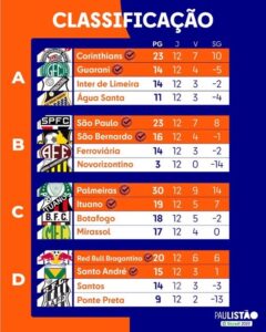 A fase de grupos do Campeonato Paulista terminou neste domingo. Corinthians, São Paulo, Palmeiras e Red Bull Bragantino se classificaram em primeiro nos seus respectivos grupos e vão jogar as quartas de final em jogo único em casa. Guarani, São Bernardo, Ituano e Santo André avançam como segundos colocados. Novorizontino e Ponte Preta foram rebaixados para a A2 do Paulistão.