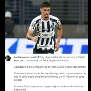 “Eu sou responsável por minhas ações. Posso errar, mas nunca será por falta de vontade ou atitude. Agradeço aos meus companheiros por terem aparecido para o resto da partida. Conheço a situação em que a equipa se encontra, tenho consciência de que a prejudiquei, simplesmente procuro dar o máximo em cada bola! A única maneira que conheço de melhorar nossa situação é trabalhando”, publicou Velázquez no Instagram.