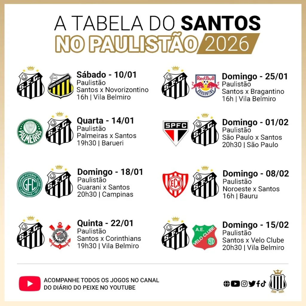 Santos divulga a lista de relacionados para a estreia no Paulistão 2026